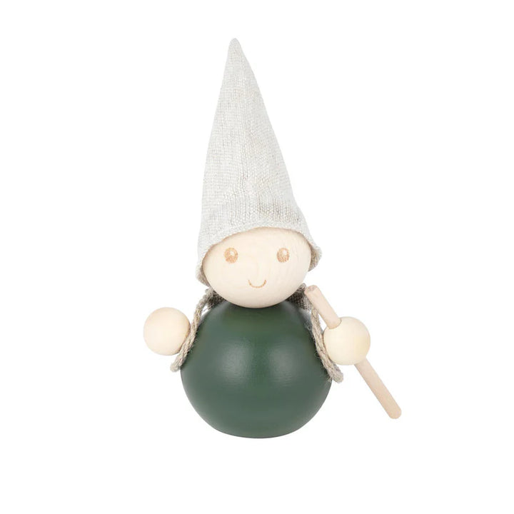 Vaeltaja-tonttu on tehty kahdesta puuhelmestä ja sillä on päässään villahuopahattu sekä selässään reppu. Yhdistä muihin tonttuihin!