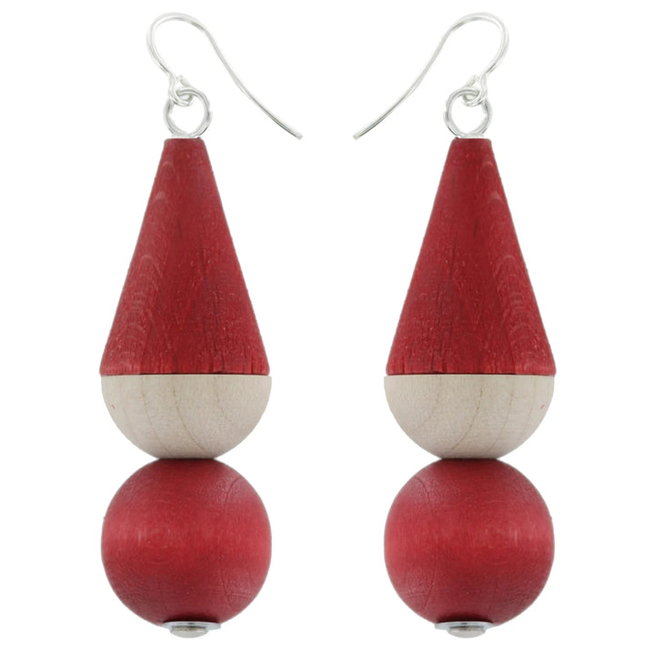 Tonttu-korvakorut ovat hauskasti tontun muotoiset. Käsinvärjättyjen, vaahterasta valmistettujen, korvakorujen koukut ovat hopeaa.