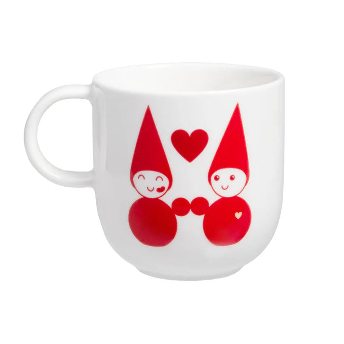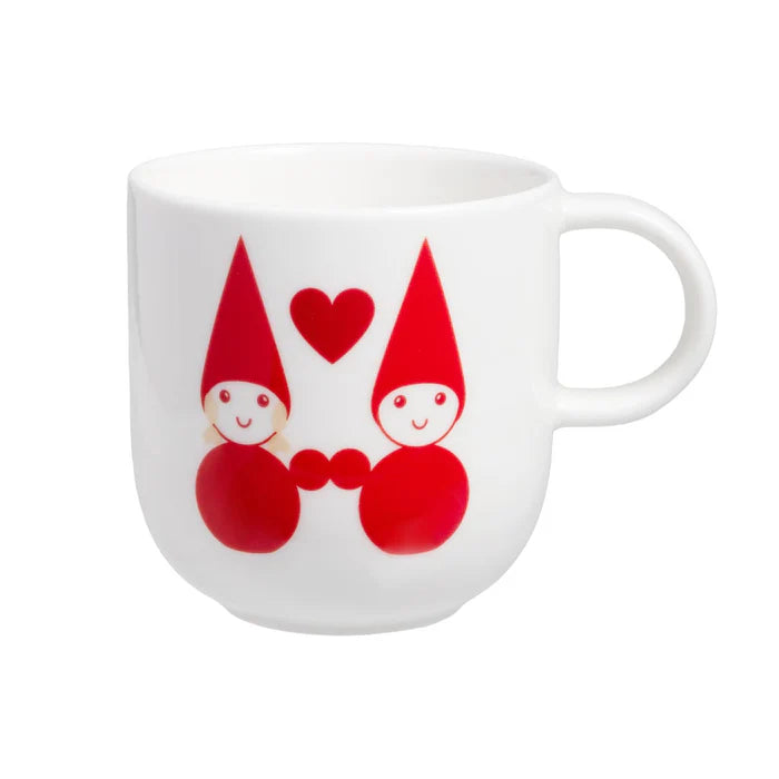 Rakastetuista ja keräillyistä Aarikan tontuista inspiroitunut valkoinen muki on muotoiltu klassisen pyöreälinjaisesti. Mukin kylkiä koristaa kaksi tonttua, jotka pitävät toisiaan käsistä. Tonttujen välissä on suuri punainen sydän. Mukin vetoisuus on 3,5 dl, ja siinä on kaareva kahva. Muki kestää pesun astianpesukoneessa sekä lämmityksen mikrossa tai uunissa.
