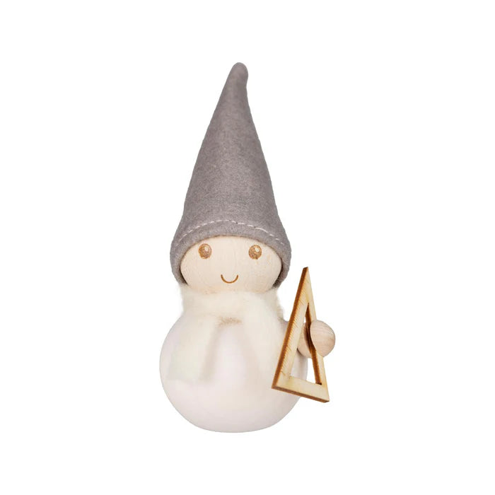 Pakkanen Insinööri on tehty puuhelmistä, sillä on huopainen lakki, kaulassa huivi ja kädessään kolmioviivain. Pakkastonttu sopii kattauksen koristeeksi, asetelmaksi ikkunalle ja lahjaksi laadukkaan, kotimaisen käsityön ystäville