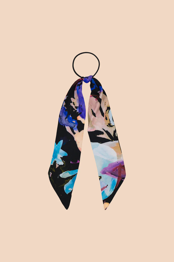 Ponytail Scarf -huiviponnarin kuosina Black Anemone. Kumiseen mustaan hiuslenkkiin on sidottu minihuivi, jonka saa halutessaan irrotettua vaikkapa muihin kampaustarkoituksiin.
