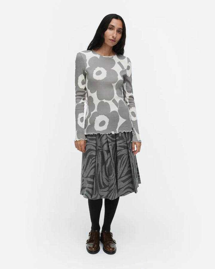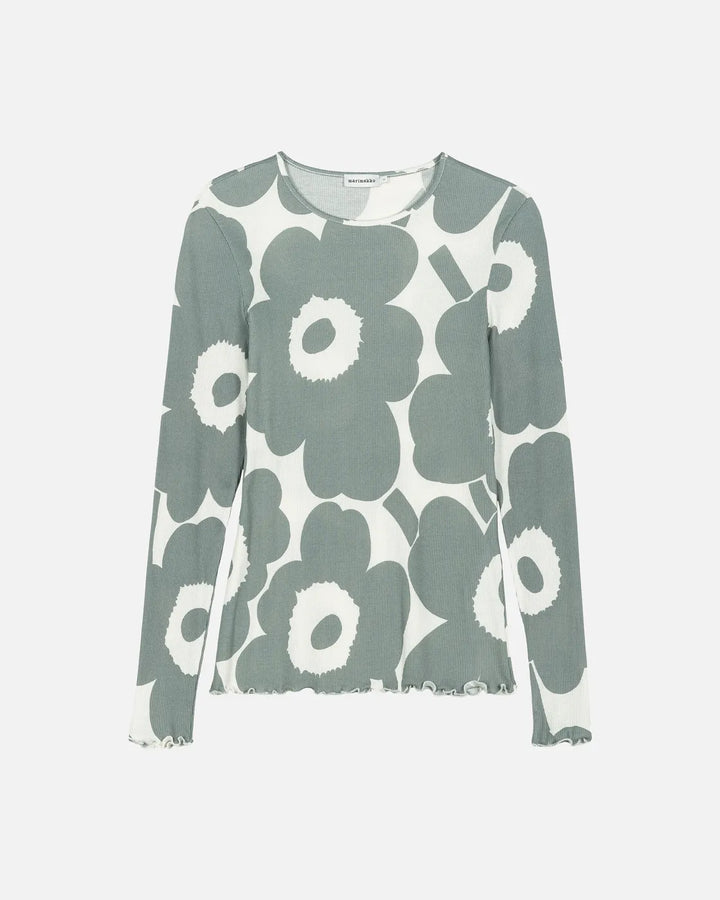 Kuvaus Floraali-ribbitrikoopuserossa on vartalonmyötäinen istuvuus, suora leikkaus ja Unikko-kuosi. Puserossa on pyöreä pääntie ja pitkät...