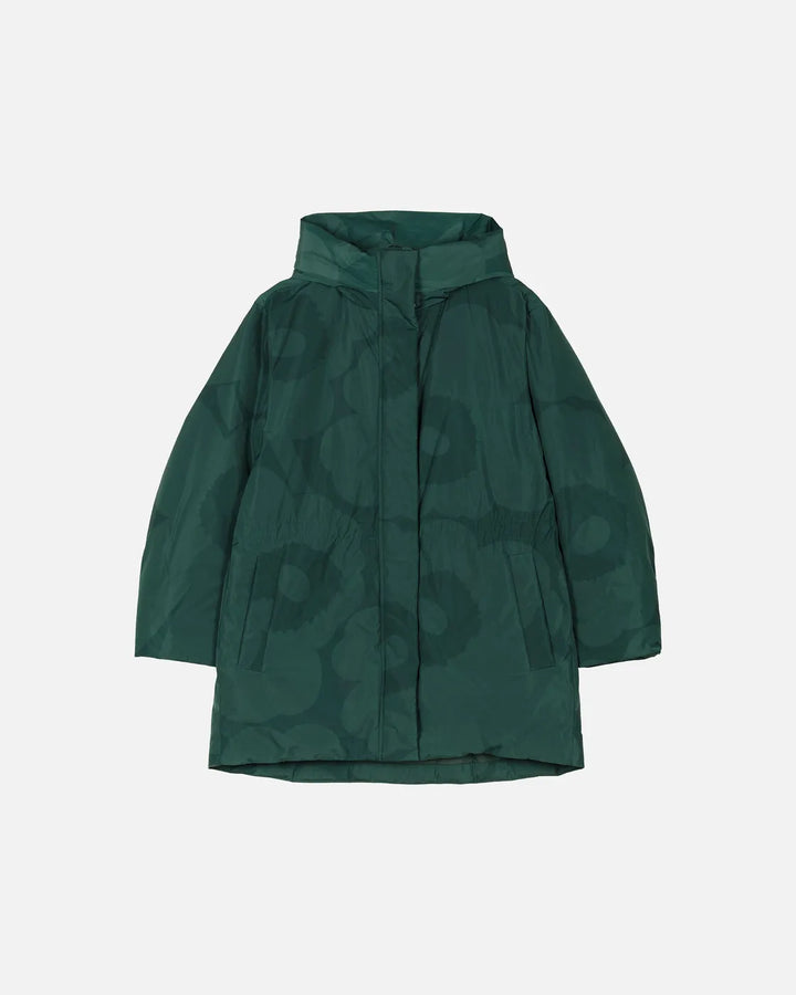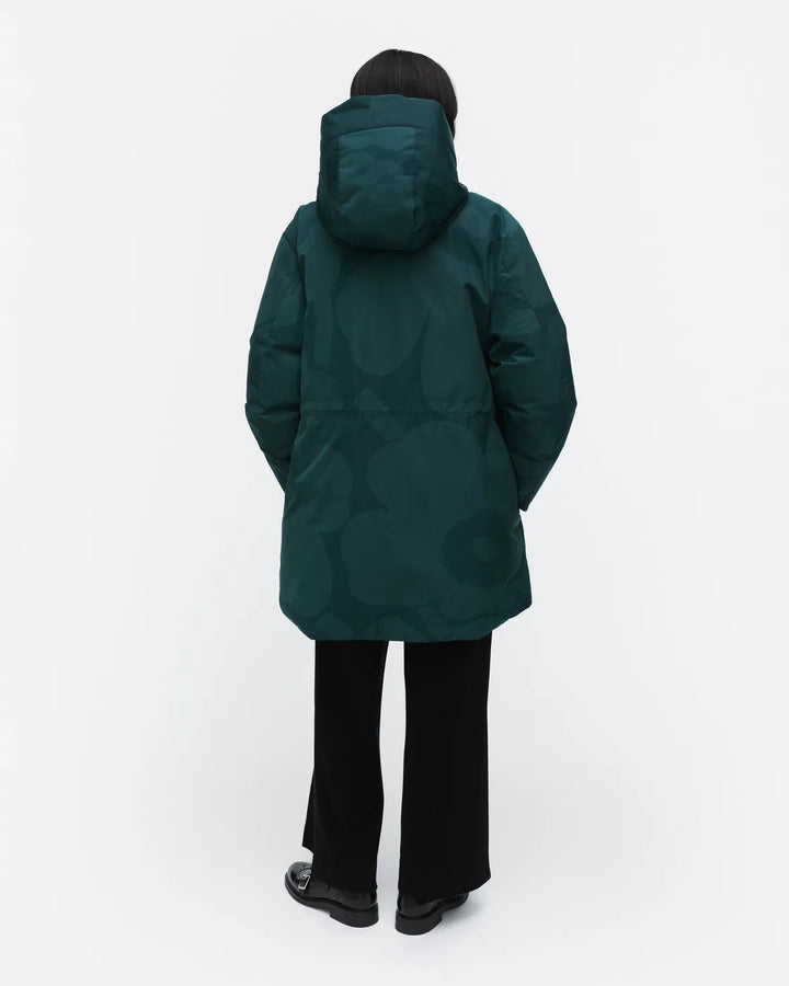 Kuvaus Käännös-untuvatakissa on rento istuvuus, suora leikkaus ja Unikko-kuosi. Takissa on korkea kaulus ja kiinteä...