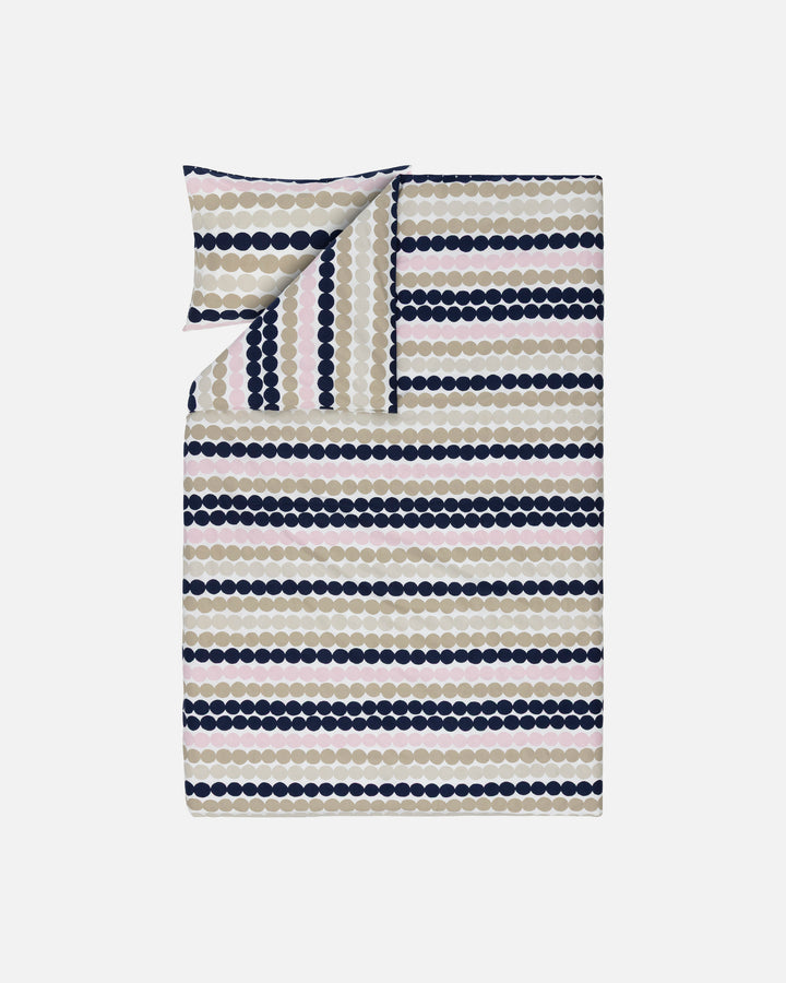 Puuvillasta valmistetussa 150x210 cm pussilakanassa ja 50x60cm tyynyliinassa on Räsymatto-kuosi. Pussilakanassa on lakanoidenvaihtoa helpottavat kulma-aukot yläreunassa ja sen lankaluku on TC 200