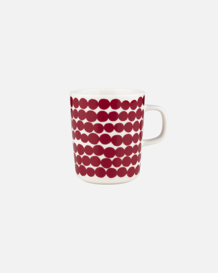 Tätä mukia koristaa Räsymatto-kuosi. Muki on valmistettu konepesun, uunin, mikroaaltouunin ja pakastuksen kestävästä valkoisesta keramiikasta.